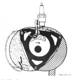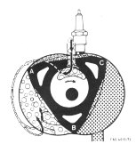 In diesem Bild ist deutlich zu erkennen, daß nach erfolgtem Arbeitstakt die verbrannten Gase zwischen B und C durch den Auslaß nach außen gestoßen werden, wobei der Kolben zwischen den Spitzen B und C eine obere Totpunktstellung erreicht, in der sowohl der Auslaß-, als auch der Einlaßkanal geöffnet sind. |