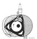 Im Zündmoment obere Totpunktstellung ¹) ist der Kammerraum zwischen A und C am kleinsten. In dieser Stellung erfolgt gleichzeitig das Ansaugen durch die Kanäle A und B. Obere Totpunktstellung = Minimales Kammervolumen |